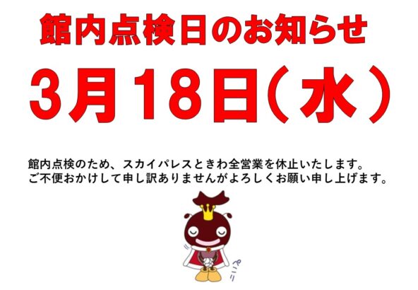 スカイパレスときわは令和6年1月1日~3月31日までの間、日帰り入浴及び広間利用を休止いたします。 田村市高齢者健康長寿サポート事業利用券をご利用のお客様はご注意下さいますようお願い申し上げます。(12月までにご利用下...