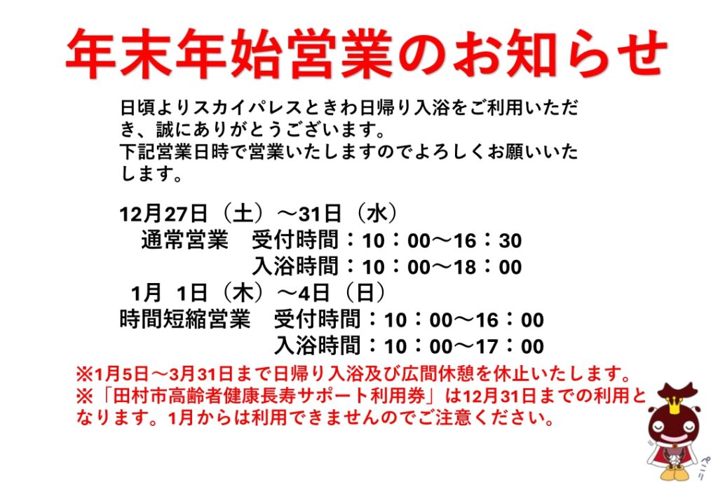 ※1月5日~3月31日までは日帰り入浴を休止いたします。※「田村市高齢者健康長寿サポート事業利用券」のご利用は12月までです。