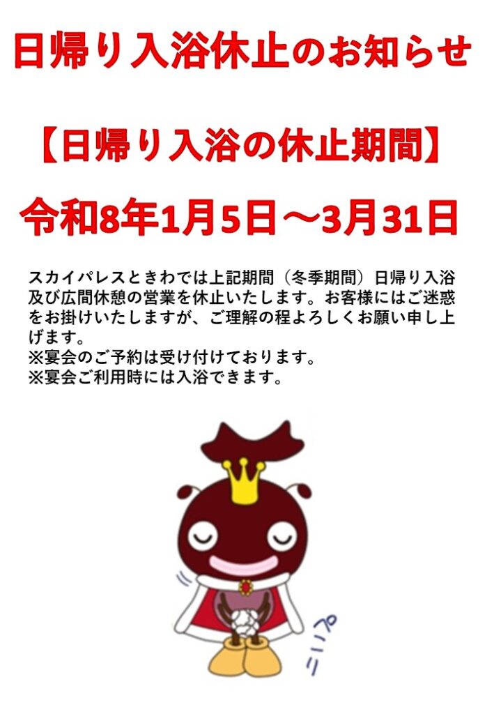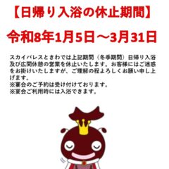 1月5日~3月31日までは日帰り入浴を休止いたします。宴会のご予約は受け付けております。宴会時にはご入浴いただけますので
