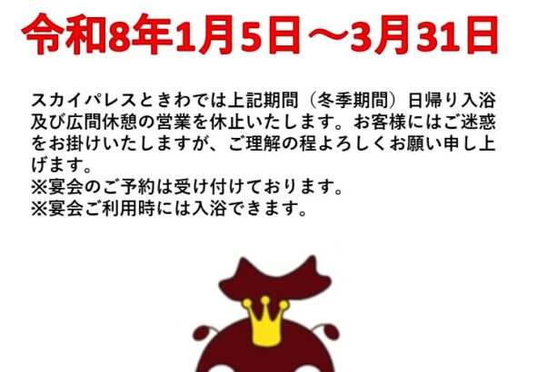 日頃よりスカイパレスときわをご利用くださいまして誠にありがとうございます。 年末年始は12月29日(金)~1月2日(火)レストラン営業いたします。 ※宴会予約のため12:00以降の営業開始となる場合がありますのでご了承...